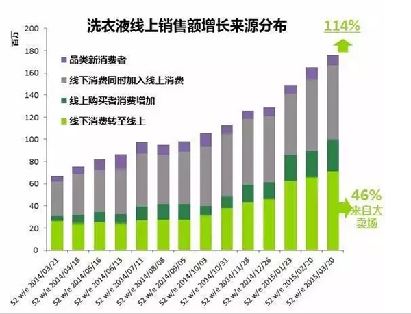 與此同時,線上銷售額增長中有41%直接轉換自線下的銷售,而這其中又有近一半直接搶奪自傳統大賣場,洗衣液的線上消費對線下購買,特別是對傳統KA大賣場的沖擊之大可見一斑。